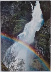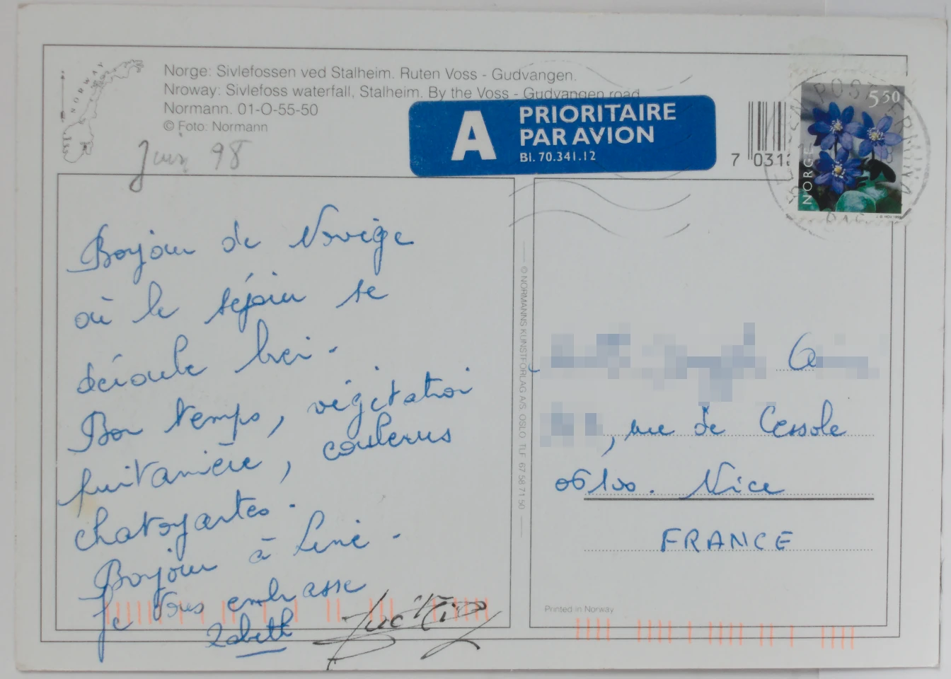 | FR | Juin 98 Bonjour de Norvège où le séjour se déroule bien. Bon temps, végétation printanière, couleurs chatoyantes. Bonjour à Liné. Je vous embrasse Zabeth [illisible] |